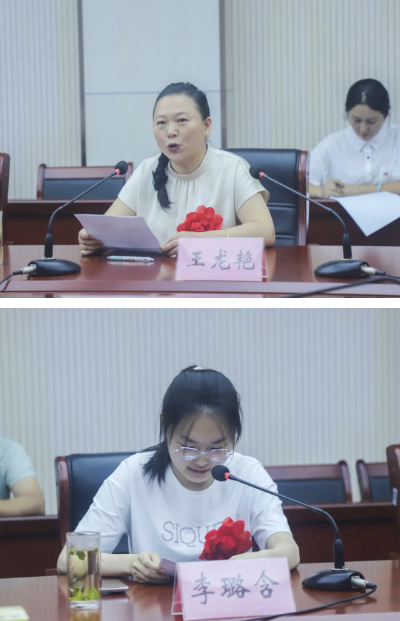学生代表与家长代表在座谈会上发言。