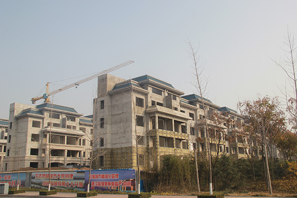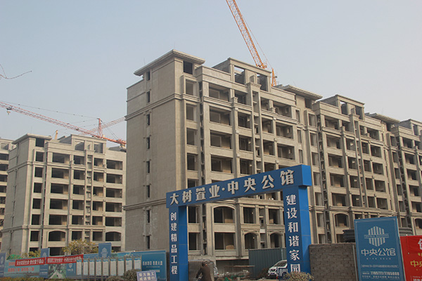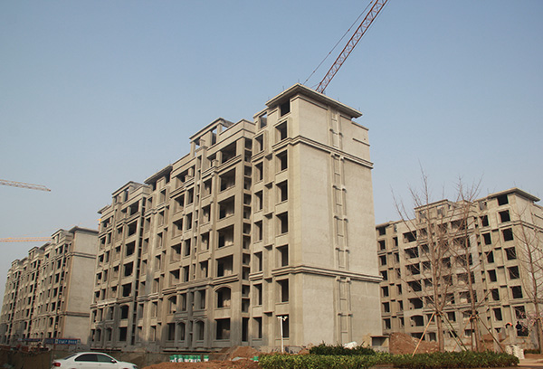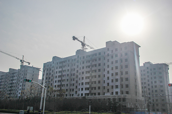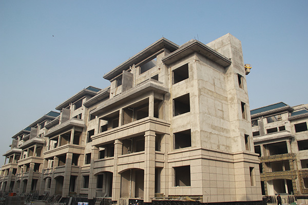 外墙抹灰基本完成,正在进行内墙白水泥、地暖及屋面施工,沿街商铺正在进行大理石干挂施工。
