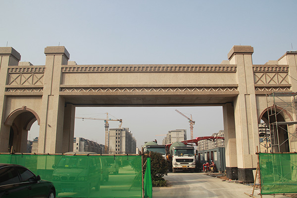 景观示范区正在进行大理石铺装、苗木及草坪种植施工;东大门细部处理完成。