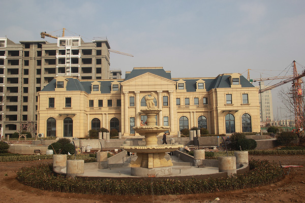 三小间防水施工完成,正在进行大理石干挂、内墙白水泥、屋面沥青挂瓦及车库顶板回填施工。