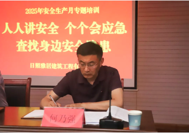 集团副总兼雅居建筑公司总经理闫海洋在会上宣读了《关于开展2025年建筑施工领域夏季高温汛期暨重大事故隐患安全生产专项排查整治的通知》和《全县住建领域2025年“安全生产月”活动实施方案》,并对下一步安全管理工作进行了详细的安排部署。闫总在会议中强调了安全生产的重要性与全员责任。鼓励全体员工积极主动参与到监督安全生产的工作中来,真正做到人人讲安全,个个会应急。